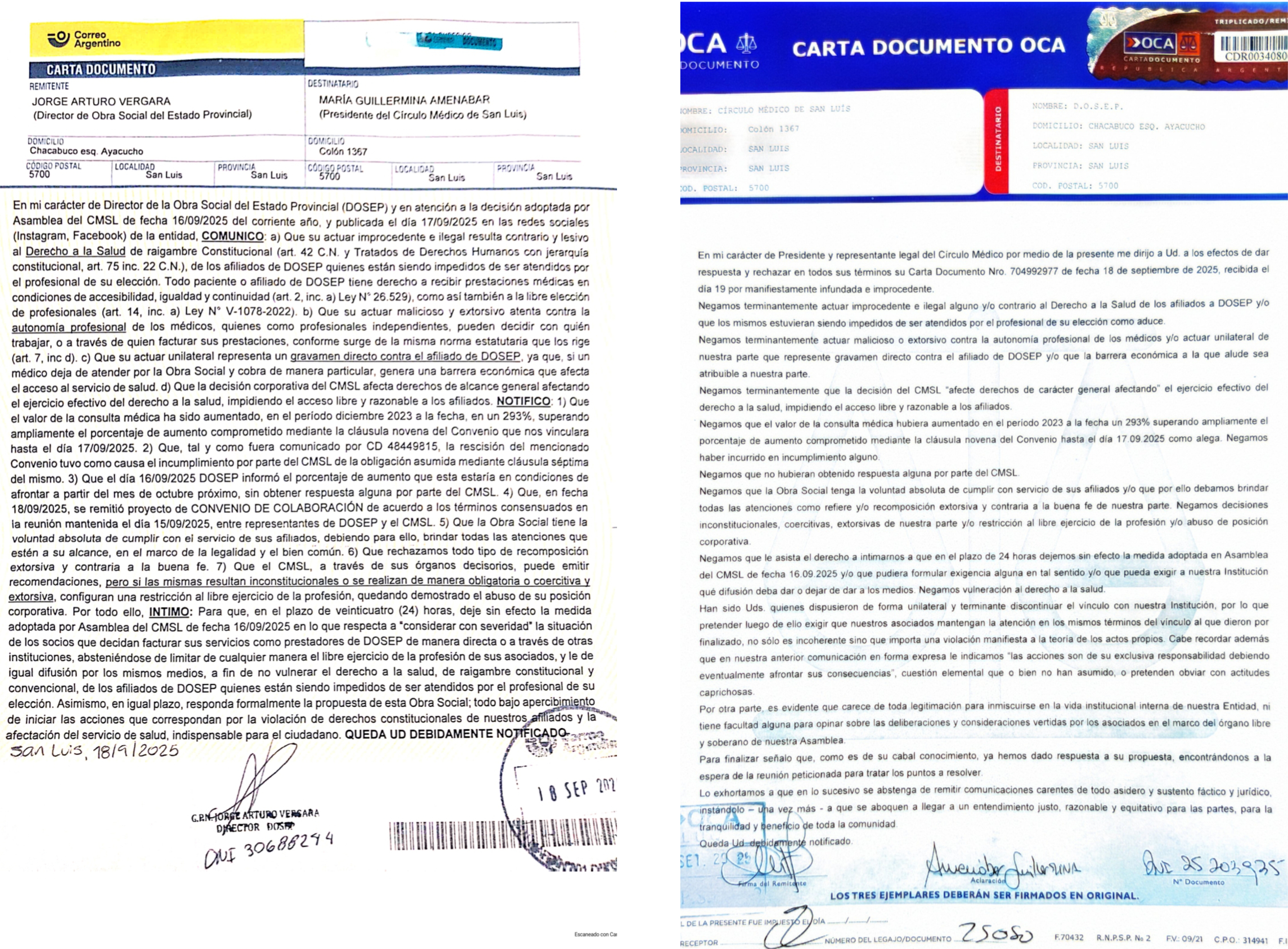 Estimados socios: Les compartimos la carta documento enviada por DOSEP el pasado 18 de septiembre y la respuesta enviada por la Presidente del Círculo Médico, Dra. Guillermina Amenábar, el día de h...